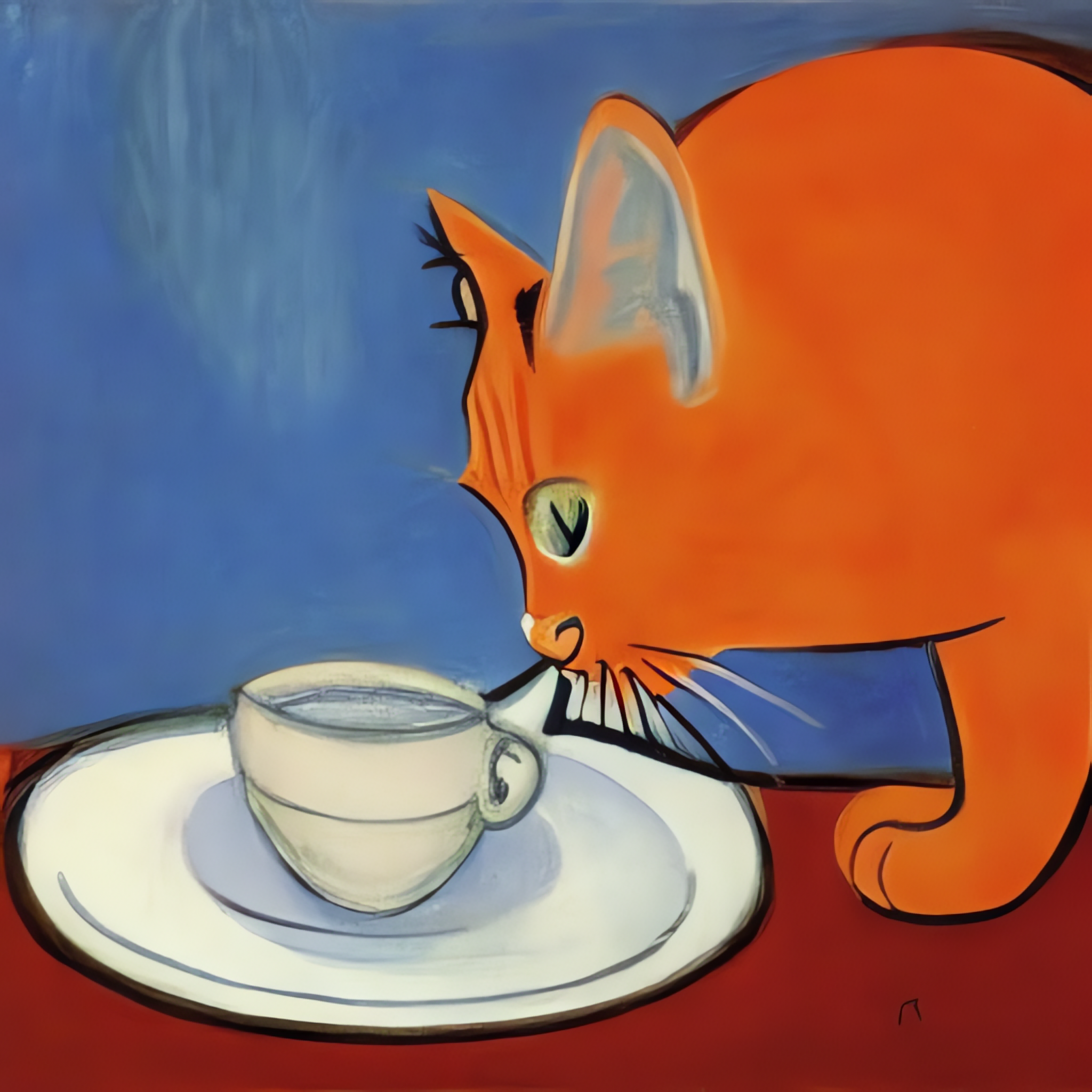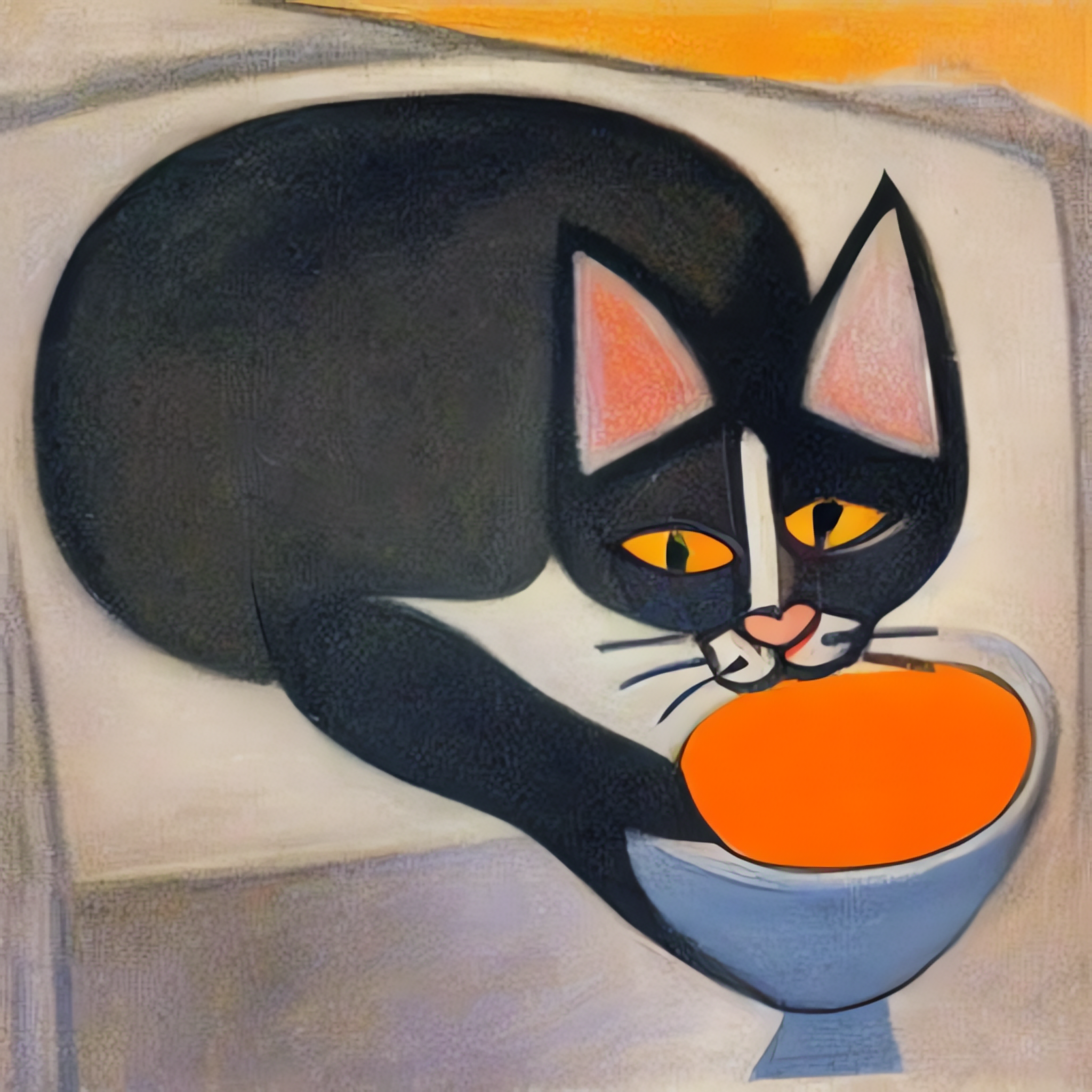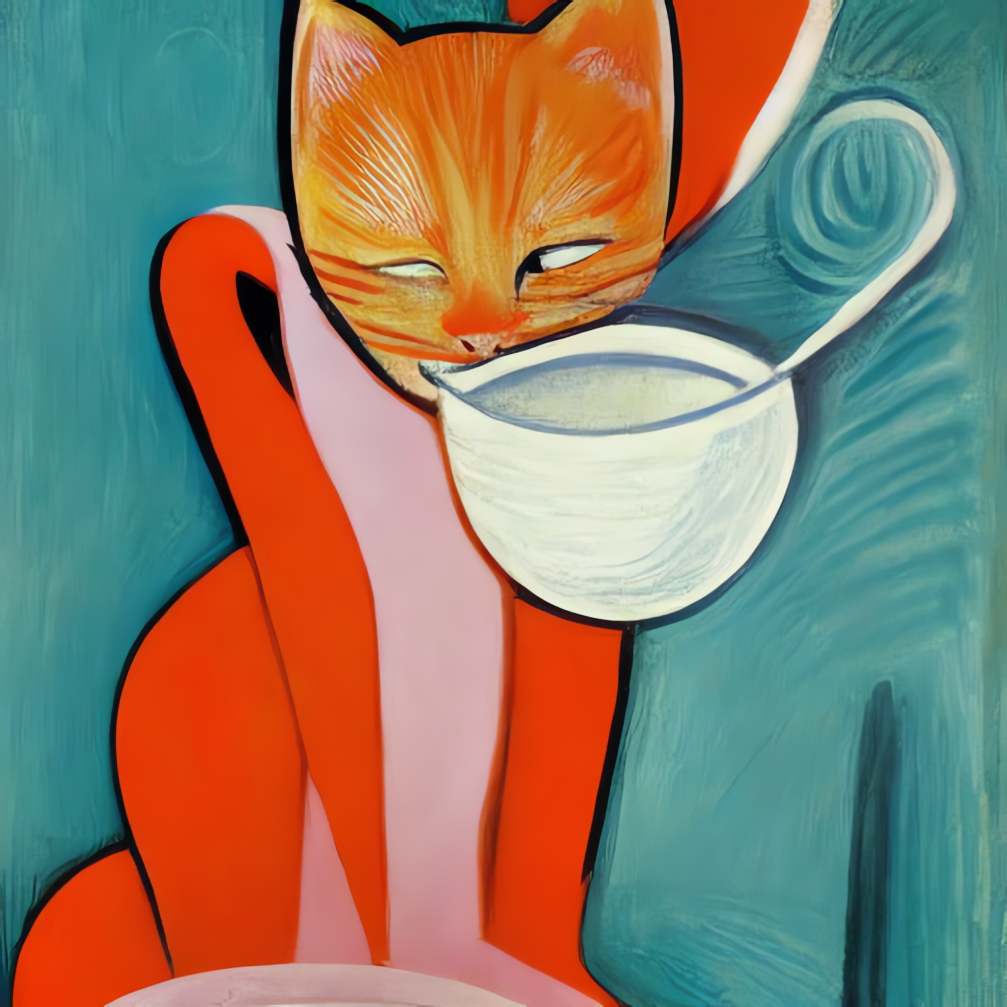 Tell me, are they not genius? DiffusionBee took 20 seconds to make each one. The exact prompt “orange kitten drinking milk from a bowl, by Pablo Picasso”. These are the cream of the crop. I cranked out hundreds, at least fifty. It’s addicting, making these things. You never know what’s going to come out, and when you land on a really juicy prompt like this one, you just don’t want to stop. (Yesterday I spent seven hours churning out AI images.)
