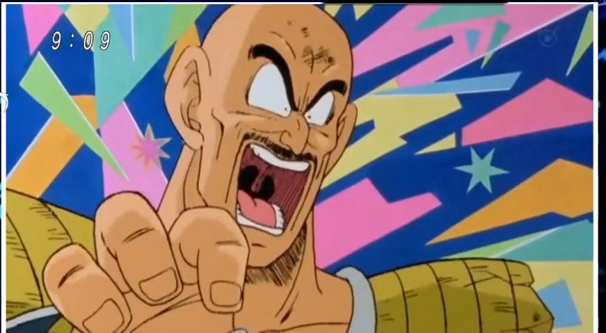 This was so shocking for Nappa to hear that the screen changed colors and became crazy (see image below). Nappa breaks out into a sweat, and says, shocked, 「“何???」(Nani?? What??) He is completely startled. He was completely unprepared for such a line from this five year old. I had to know what Gohan said that got Nappa so riled up. I knew Gohan was saying 母さん, “mom”, but after that? Nappa’s mom is what?? I replayed the audio twice, then turned on the subtitles for guidance, and I saw it. Gohan says, “Omae no kaachan debeso!!!!” meaning, “Your mom has an outie!!” And this was apparently an incredible dig, because that line sent Nappa into a frenzy.