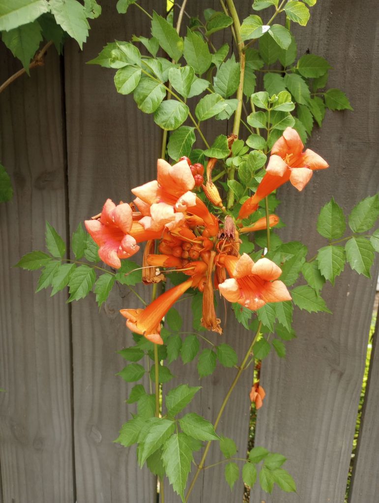 After thinking about honeysuckles I noticed this one on a walk. One of the native honeysuckles, called Coral or Trumpet Honeysuckle (I hope I IDed it right)